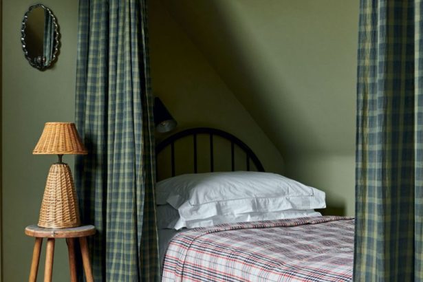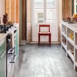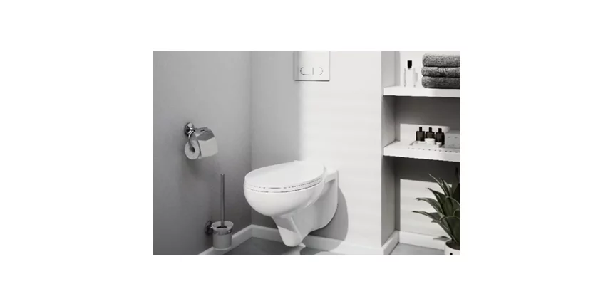 Phòng tắm sang trọng này có thiết kế hiện đại với giấy dán tường hoa màu phấn nhẹ nhàng, bồn cầu treo tường…